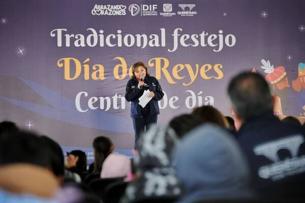 El presidente municipal de Querétaro, Felifer Macías, acompañó a la presidenta del Patronato del Sistema Municipal DIF, Adriana Olvera de Macías, y a la directora del DIF Municipal, Gabriela Valencia García, en la tradicional celebración del Día de Reyes, organizada para 150 niñas y niños de los Centros de Día Njhöya, Jädi y Meni.