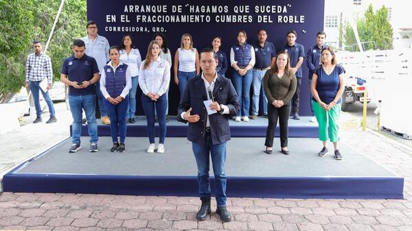 El presidente municipal de Corregidora, Chepe Guerrero, junto con miembros de su Gabinete, dio inicio a la estrategia ?Hagamos que Suceda? en el fraccionamiento Cumbres del Roble, con la cual se ofrecerán 16 servicios municipales por parte de las distintas dependencias, beneficiando de manera directa a los habitantes de los condominios.