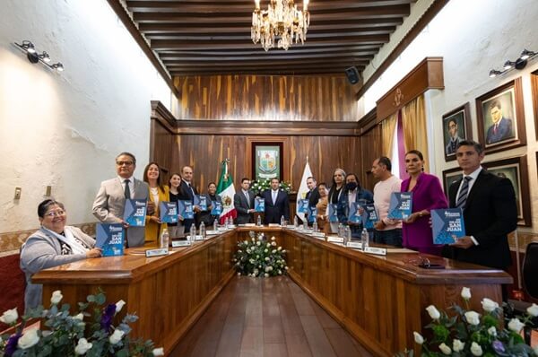 Durante la sesión solemne de Cabildo -donde el presidente municipal refrendó su compromiso de consolidar vialidades estratégicas, profundizar la proximidad policial y la justicia cívica, blindar el abasto de agua, ampliar los programas para la mujer, de salud comunitaria y sociales, así como actualizar el Plan Municipal de Desarrollo Urbano-, Roberto Cabrera estuvo acompañado de las y los síndicos y regidores del Ayuntamiento, y por los integrantes del Gabinete Municipal.