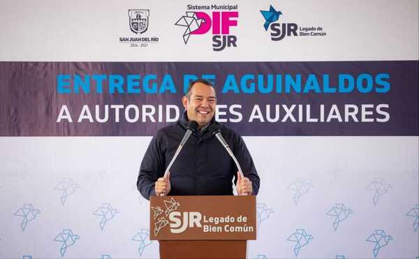 Con la finalidad de brindar acompañamiento a la sociedad sanjuanense, expresarle un reconocimiento institucional, cariño y poner de manifiesto los motivos para sentirse cercanos y apoyados por las autoridades municipales, la presidenta del Sistema Municipal para el Desarrollo Integral de la Familia (DIF) de San Juan del Río, Gina Sánchez Barrios, y el alcalde, Roberto Cabrera Valencia, encabezaron la entrega de más de 26 mil aguinaldos a autoridades auxiliares.