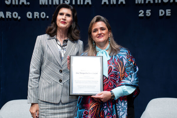 Durante su mensaje, la ministra Ana Margarita Ríos Farjat agradeció el homenaje, y resaltó las coincidencias con el gobernador de Querétaro, respecto al valor que tienen las instituciones, las cuales, expuso, ponen las reglas del juego formalizadas para dar certidumbre a la sociedad y permiten desde lo individual, vivir la vida a plenitud.
